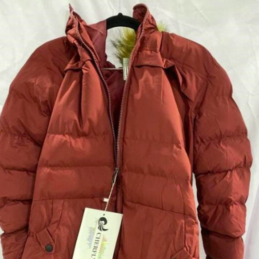NEW CHERFLY Womens Cotton Winter Coat Thick Warm Long Jacket with Fur Trim Sz M